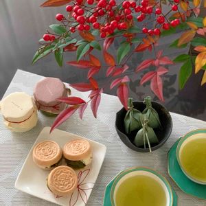 今日の花、南天🔴🌿 お正月は朝から昼前までゆっくりお節料理をいただくので、お昼ご飯は抜きでおやつタイム⏰があります 元旦は花びら餅とお抹茶、今日は手作り最中です🎶