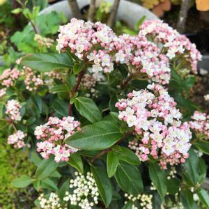 ビバーナムイブプライス 去年ビバーナムティヌスを枯らしてしまったので、今年又買いました。 ポットを鉢に入れた仕様で根が回っていたので鉢ゆるめしました。 ティヌスよりやや小さな花です。