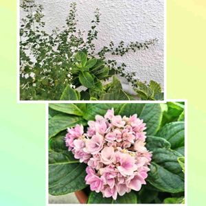 風が強くエンペラーズミントの枝が 流れています その右下に季節外れの紫陽花が 咲いています🍃
