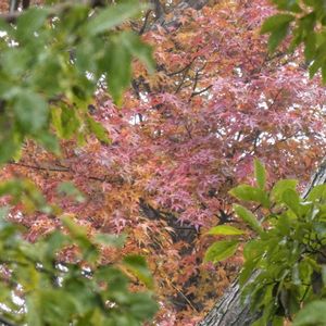 「モミジ🍁」 緑色の葉の向こうには、真っ赤なモミジ🍁が目を引きます。