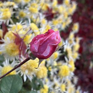 バラ🌹𖧷 ⁺. 菊🌼𖧷 ⁺. モミジ🍁 寒い朝。 凍えそうになりながらも、蕾を膨らませている薔薇🌹 健気です☺️ この菊も毎年実家の庭に咲いてくれる古株さん。 バックのモミジ🍁がハラハラと~。 🏷️つぼみに魅せられて 参加させていただきます(*^^*)