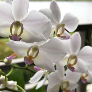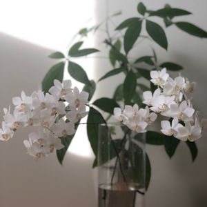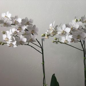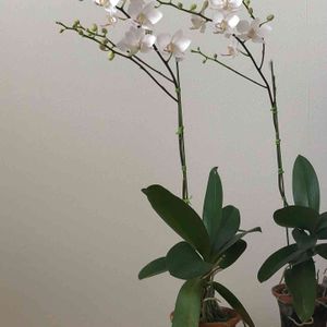❄️ミニ胡蝶蘭 なごり雪❄️ 左から1号、2号。 強風から室内避難中、伸びた花茎に支柱立て。 今年2度目の開花は10月から11月を予定。