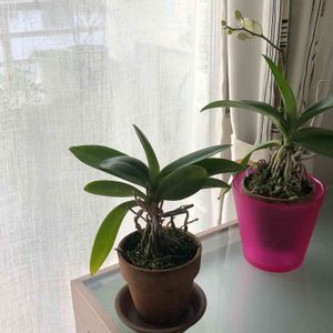 ミニ胡蝶蘭なごり雪 2株 2010〜 開花サイクルの早い品種 2019 の開花 左 5月24日 植え替えのため花芽カット →9月23日 10輪満開 葉っぱ9枚 右 8月10日 4輪 →12月7日 咲き始め 蕾5つ 葉っぱ7枚 根のパワフルな成長、花の美しさ、育てて嬉しいミニ胡蝶蘭です。