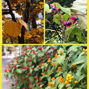 毎月恒例の お墓参りに 行きました。 ↗️「クサギ」でしょうか? 違っていたら教えて下さいね🙏 赤いガク(?)が開いて 綺麗な青い実💙✨ ↖️「マンサク」葉が すっかり黄色になり 花芽も ついていました。 ⬇️「センリョウ」 赤色🔴黄色🟡の実が ザックザック✨✨
