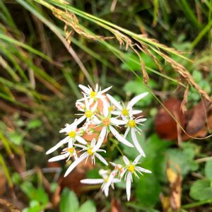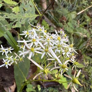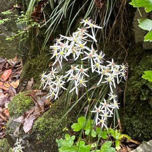 非常に美しい花を発見! 「ビューティフルサンデー」 日本固有種、岩壁の植物 ナメラダイモンジソウ(滑大文字草) ユキノシタ科 ユキノシタ属 ダイモンジソウの変種で、本州の中部地方以西と九州に分布し、渓流沿いなどの絶えず湿った岩上に生える多年草です。 「ナメラ」の名の由来は、「発見地の山口市の滑山にちなんだ」という説と、 「表面が滑らかな、渓流の岩場に生育するから」という説が有りますが、 ここは、垂直どころか 逆にオーバーハングして常に、上から水滴が滴ってる岩壁です。 春に、バイカオウレンが居た所です。 「大文字」は、もちろん花の形が「大」の字に似ていることに由来しています。 尚、本変種はしばしば、カエデダイモンジソウと呼ばれてきたそうです。 花は、ダイモンジソウと区別できないほど似ています。 ダイモンジソウとの相違点は、葉の形状にあります。 葉は根茎から束生する。 葉身は腎円形、基部は心形で、掌状に5~7中裂〜深裂し、まばらに毛が生える。 葉の裏は、ピンクっぽいです。   母種のダイモンジソウの葉は5~17浅裂することにより区別される。 花弁は平開し、ふつう白色。 上側の3弁は楕円形で長さ3~4mm、基部に短い爪がある。 下側の2弁は線状楕円形、長さ4~15mm。 上向きに咲く場合、花弁は5個ともほぼ同長となる。 雄蕊は10個で、裂開直前の葯は橙赤色または暗紅色。子房上位。 花柱は開花時には長さ約1mm。 近縁種 : ダイモンジソウ、ジンジソウ 別の変種:ウチワダイモンジソウ ■分布:本州(中部以西)、九州 ■生育環境:山地の渓流畔などの湿った岩上など。 ■花期:7~11月