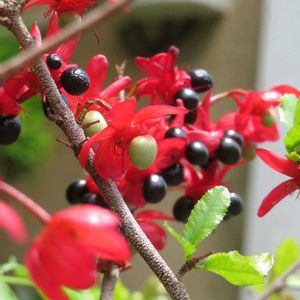 オクナ・セルラタ オクナ科オクナ属 低木 開花後に残る赤い萼と花托、黒い果実の様子からミッキーマウスの木と呼ばれている。 6月8日 場所:豊橋市
