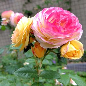 ロソマーネジャノンが咲き出しました🌹 ピンク、オレンジ、イエローのグラデーションの花びらがなんとも言えない美しさのあるバラです😊