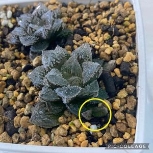 魔剣ちゃんに子株出ました🎉 黄色の丸印の所です! 500円玉よりちょい大きめ位なんですが子吹き☺️ こんなサイズでも子株出るんだ〜って思ってます! 大好きな魔剣、増えてくれるのはとても嬉しいです😆