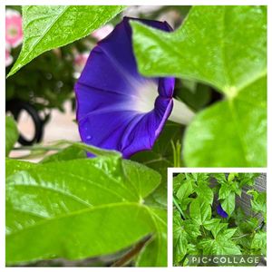 アサガオ3番目の花🌸 葉っぱの陰に隠れて、咲いてます❣️ シャイだわ〜😌 控えめだわ〜😌 人も、幾つになっても、こうあらねば… 己を戒めつつ… 朝から悟りの境地😅😅😅 ブルーが濃くて、気品と強さを感じます。