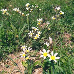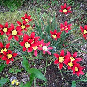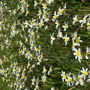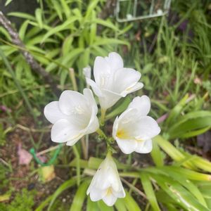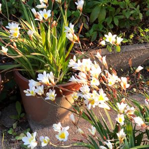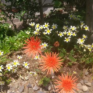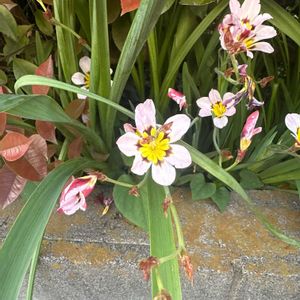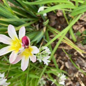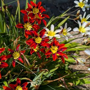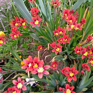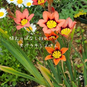 こぼれ種のスパラキシスが荒れた庭に花を咲かせています。