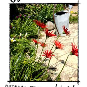 可愛い姿のガーベラ ブリキのジョウロはお気に入りの庭のアイテム ♡♡♡♡♡ おやすみなさい〜🌛 明日も宜しくです🎶🥱