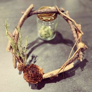 ほぼ近所の公園で拾ったもので リースを作りました。 色味が欲しい…