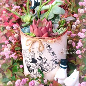 多肉寄せ植え初め🪴 12月になってから なかなか多肉を植える作業が出来ず 仮植えしたのや カット苗のまま 冷暗所に置いて時々日光浴させたりとか とにかく仮の状態で その場を凌いでました💦 リメ缶はインスタの抽選販売でお迎えした りりさんの作品 多肉は 45さんからのをメインに うちにあった徒長多肉 葉挿しで育った多肉など リメ缶の前にいるのは ムーミン谷のめそめそです 来月2月9日は「ムーミンの日🏷」 開催しますね♪ よろしくお願いいたします☺️ 多肉ラボ©︎お題🏷「今年の抱負」 実は多肉歴だけは無駄に長い私 葉挿しっ子をスクスクと 育てられるようになったのも つい去年のことで😅 この勢い(言うほどでもない)で ①寄せ植えや丼用の葉挿しっ子を 沢山増やしてみたいな〜🌱🌱🌱 寄せ植えが平たくなりがちなので ②立体感のある寄せ植え作り ③エケベリアを綺麗に管理したい →これが一番難関かも まだコツが掴めてません😓 こうすればいいのよってアドバイス お待ちしております💓 メインの大きな多肉は名札なしでした 何だろうな〜