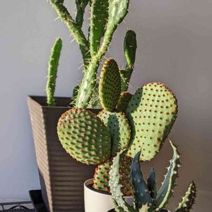 オプンチア。。。 ヒメウチワサボテン。。。🌵 ( ᐛ👐) パァ〜 この子は8月に子株ちゃんが出来た😙🙌と喜んでいましたが、その子株ちゃん、色が変わってしまい、1回取れました😭 が、さすが繁殖力が強い子で、その後すぐに新しい子株ちゃんがつき、この通りです( ᐛ👐) パァ〜 右側の子には斑が入ってて可愛いです😍 チョット変わってるからこのまま緑にならないで欲しいなぁ。。。🤗