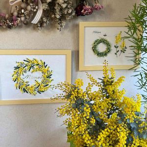 ミモザの季節💛 庭のミモザが随分咲いてきました🟡🌿 ポンポンまん丸に弾け始めてますよ🟡🟡🟡 刺繍でミモザを咲かせてみました🧵 小さい枝のミモザかな✨ たっぷり満開のミモザは制作中❀(*´▽`*)❀