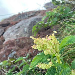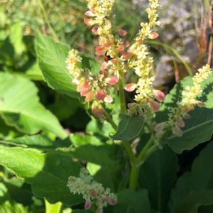 御山蕎麦 タデ科オンタデ属 7月〜9月 茎はよく分枝して、紅色を帯びる。葉は長さ4~12㎝の卵形、ほとんど柄がなく、基部は円形~広くさび形、両面とも無毛、縁に細毛が生える。花は普通は白~黄白色だが、淡紅色を帯びるものもある。花被は5深裂する。