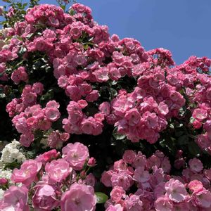 我が家の手間いらずのバラ ➊❷バレリーナ 一重でノバラみたいな可愛い花 ➌❹❺アンジェラ エントランスから車庫に。 日除けになっています。 2024年5月18日撮影です。