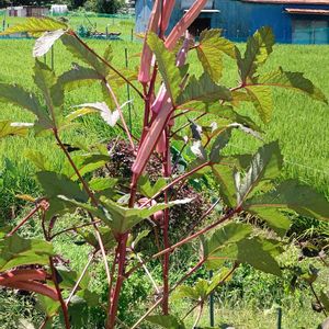 おはようございます👋😃 台風⚡️🌀☔️は大丈夫だったでしょうか⁉️こちらも、風の強い1日でした。 先日出掛けた時に見かけた赤いオクラのでっかい物、これは何でしょうか🤔 離れた場所から見下ろすかたちで撮ってます。Google Lensは「赤オクラ」とか「観賞用オクラ」と答えます。 普通のオクラの4倍位ありました。教えて下さい😊 (2022/9/3撮影)