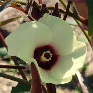 平日は出勤後にしか咲かないオクラの花🌼、こうしてよく観るときれい✨だなぁ😊。 赤オクラ、ワイン🍷レッドの茎と葉🌿の緑とマッチして、独特の良さを醸し出してる。