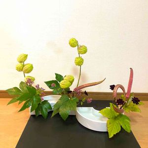 自主練習です。 オクラ以外は育てた花です。 チョコレートコスモスがいい味出してくれました😊