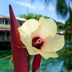 海辺のレストランで自家栽培していた赤いオクラ。 オクラの花ってキレイですよね。ハイビスカスみたい。