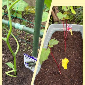 おはようございます。今日は海の日、孫2人がお泊まりでした。晴れ、はや30.6℃、9:00ムシッと暑い。チマサンチュ、13日目、たくさん発芽、明日は間引きしようかね。赤オクラ、苗植えして22日目、3本とも花が咲きました。昨日てんとう虫🐞と投稿してましたが、てんとう虫だまし(ニジユウヤホシテントウ)というナス科農作物の害虫と教えていただきました。即駆除しました。ひまわり、脇芽からの花が咲き始めました。キュウリ、花咲けど雄花ばかり、早く雌花が咲いて欲しいなぁ〜。🥰😻😍☺️😸😋
