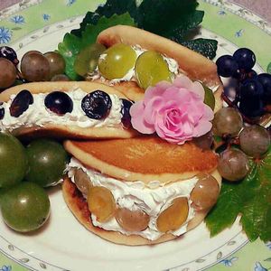 〃^_^〃♪葡萄を一杯はさんだ(≧∇≦) ブドウサンド・クリームサンド・ フルーツサンドです!(>_<)少し詰めすぎて モコモコな状態~〃^_^〃♪ お腹一杯になります。一個で十分です(≧ω≦) バラは、庭先で咲いたもの:(T-T):飾りました。 葡萄も、庭先で実ったものだよ〃^_^〃♪