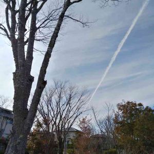 いつもの散歩道 公園にて 針葉樹と飛行機雲🛩️