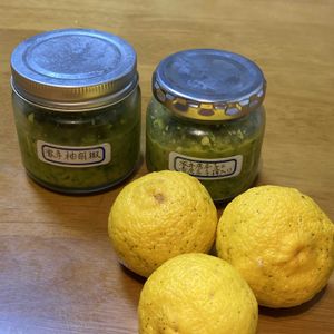 頂きものの柚で柚胡椒を作りました。 例年は青い柚だったけど、今年は黄色の柚を頂きました。 青唐辛子がなかなか見つからなくて、諦めた頃に地元の物産所で激辛唐辛子を見つけました。 黄色柚には赤唐辛子でも良いそうですが。 青柚よりも黄色柚の方が香りが高いらしいです。 別の物産所で見つけた青唐辛子は小さくて一つずつ種を取り出すのも大変だったので、そのまま刻んで使いました。 凄く辛いと思っていたけど、程良い辛さで市販のものよりも美味しいと感じました。😋🥰