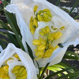 おはようございます🌅😊 晴れの寒い土曜日の朝(早朝)です🥶😆😊👍✨ ✨今日のお花✨🌸シンビジウム🌸です😆👍 お出かけ先で撮影しました😆👍🚗💨 販売していたシンビジウムなので袋が被っていますが😆👍✨ 黄色のシンビジウムです😆👍🟡🟨🌼 綺麗です🤩🤩✨✨