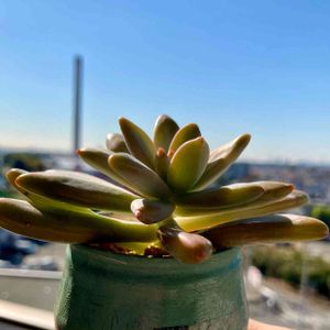 今朝はお世話をするのに精一杯で写真を撮る余裕がなく 💦 撮り溜めていた画像から… 先日投稿した寄せ植えの上から画像です。 手前はもともと家にいたチワワ・エンシスちゃん。 奥のエケベリアさん2つは分かりません💧桃太郎さんかな?と思ってますが 合ってますか?? グラプトペダルムも何か不明…。 朧月?色が変わったら分かるかな🙃
