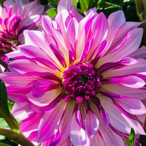 10/29㈯④ ダリア ノーブルライト ③【インフォーマルデコラティブ咲き】 八重咲き。幅広い舌状花が捻れています。 鷲澤幸治さん作出。中大輪.花径21cm 捻れた花びらが花びら裏の濃い紫色を見せて魅力的です😄🤍💟💜