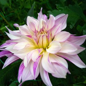 8/10㈭④ mimozaさん発信 🏷0の付く日は雨粒の日 ダリア ノーブルライト 鷲澤幸治さん作出のダリアです。 表裏で色が違い、ニュアンスからーの紫色が魅力的です。 中大輪で21cmくらいの花径です。 雨粒が乗って綺麗でした✨ 2020年7月町田ダリア園にて