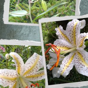今日のお花、ユリ✨🤍🧡🤍✨ 我が家のユリの開花は、スカシユリが間もなく…、他はまだまだ先のようです😆 ①② 昨年のヤマユリを懐かしんで… ④⑤ 大好きなダリアが咲き始めました🎶🎶