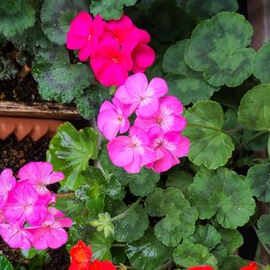こんばんは😃🌃 プランター45に、3色植え付けたゼラニウム。 ビニール袋の中で、冬越してくれたゼラニウム。 奥がなかなか咲かなかった明るい濃いピンク。 良く咲いているピンク。 手前は、朱色かな。 まだまだたくさん蕾があがっています。