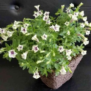 こんにちは👋😃 3回目の摘芯から、 ペチュニア、紫小紋 花が、たくさん咲いてくれてます。 なぜか、花が、これ以上開きません‼️ そういう特性みたいです‼️ この雰囲気も、良いです。 5号かご鉢です。 そろそろ、7.8号の鉢に、植え替えかな? 植え替える前に、もう一度切り戻しかな?