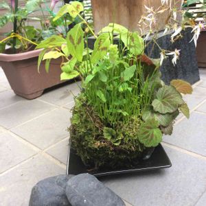 山野草で苔玉作った✨ 自然の苔だから外の環境が1番なんだそうです! すっごくボリューミーで 大事に育てます。 一緒に行った子供が石もらってきた… どーしよう。