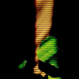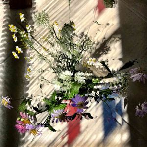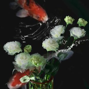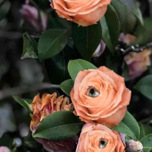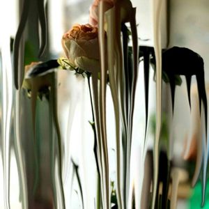 庭の薔薇🌹ゴルチェの香水瓶を花瓶として使用。光の投影で帽子?を被った女性の様な、影絵に見える?