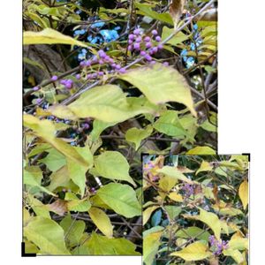 今日のお花コムラサキさんの自生種 紫式部さん🎶 ①木の写真を撮ろうとしたら、一粒見つけました🟣 👀❣️ ②近くに🟣🟣🟣🟣🟣🟣🍁💛🎶 ③上を見上げたら大きな木に実が沢山付いてました🤩🎶🎶