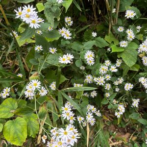 シロヨメナ(ヤマシロギク) シラヤマギクと紛らわしい名前💦 またカントウヨメナと同種かと思ったら、 ノコンギクに近いらしい💦💦 山林、山縁の半日影 花弁は細く空いている(シラヤマギクよりは密) 筒状花が目立つ 総苞はワイングラス型 葉は長楕円で縁はギザギザ 表面はスベスベ