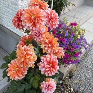 久々の投稿😅 夏は水やりに追われだめですね…💦 急な秋の到来に寄せ植えをしてみました😊✨️ ダリアラベラグランデのアプリコットやゲブラさんの霧島の秋をメインに仕立てております🍁