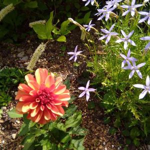 ダリア ラベラ・グランデが開花しました🏵️✨ 冬に枯れたのが春に芽吹き、花が咲くと、 うまく育ってるな~ と、 嬉しくなります☺️ 種から育てた二年目のイソトマと一緒に📸