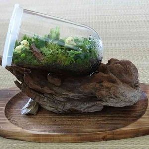 中ガラスは この間拾った流木に着けて さらに100均の木製トレーに着けました 可愛いコケリウムに仕上がりました💗