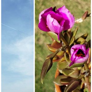 ⬅️5月5日の朝の空ですが、珍しい現象が見られました。😄 飛行機が飛んでいる後ろに飛行機雲ができているのはよく見る光景ですが、この時は、まるで飛行機が進む方向を示しているかのように、飛行機の前方に線が見えました。😃✨ ➡️一昨日(5月6日)、午後4時近くになって、アナカンプセロスのお花が咲いているのを発見‼️ もう、少し閉じかけているのかな?😆 購入した時に付いていた🏷️には桜吹雪と書いてあるのですが、吹雪の松に見えます。😅 頑張ろう❗日本‼️ 👊✨