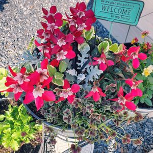 ♡寄せ植え♡ ガーデンシクラメン ジックスさんをメインに寄せ植えを作りました❤️╰(*´︶`*)╯♡ *花材 ・ガーデンシクラメン シャインレッド ・ガーデンシクラメン ジックス2株 ・キンギョソウ ブロンズドラゴン ・ロータスブリムストーン ・シルバーレース2株 ・へデラ ピッツバーグ 10号鉢に8つの苗を植え込みました❤️ ちょっとアンバランスになってしまいましたが…まあそこはご愛嬌で🤣💕 わかりにくいのですが、中心のキンギョソウ ブロンズドラゴンがシクラメンに絡む感じが気に入っています🎵 今月はGS1周年の記念月なので華やかに作ってみました🥰