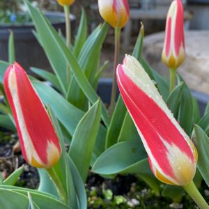 昨秋いただいたフォトコンの賞品の秋植え球根チューリップ。咲きました。 ☆٩(。•ω<。)و 品種は多分「桃太郎」白色×桃色 鮮やかな色が玄関のビオラたちにプラスされました💕