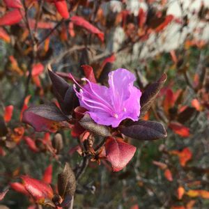 最近、ところどころで見かける 色づいた葉っぱの中に 狂い咲きした花🌸 春一番に咲くエゾムラサキツツジ 冷え込んだ数日間の後に また暖かくなったりしたからだね💜