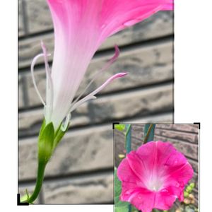 2つめのアサガオ咲きました またピンクです🩷 1つめのより少し色が薄いかな? 雨があたったので花びらが傷んで… 花の付け根を見ると。。。 わずかにスプリットペタルの特徴を発見😜 パッと見は普通のアサガオっぽいけど、ちゃんと親の遺伝子を受け継いでるんだねーー💕