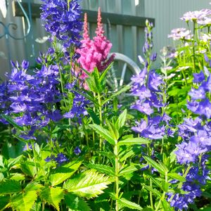 ①もうそろそろ終わりかも?な タマシャジン 手前の半減した(笑)オレガノと濃いピンクのクリーピングタイム 向こうには一重咲きのロクベンシモツケとチラッと真っ青なベロニカ・クレーターレイクブルー ②ティアレラ ピンクスカイロケットの2番花が咲き始めました¨̮♡︎ ③ロサ・カニナ
