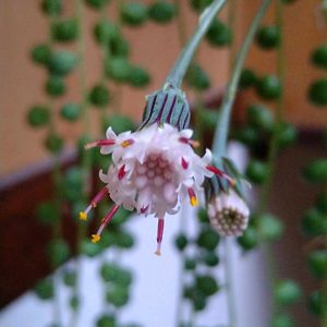 ❅ピーチネックレスの花❅ なかなか咲けずにいましたが室内に取り込んだら開いてきました✨ 階段の壁にワイヤーの棚作ってネックレス系を置いてるんですが… 長く垂れ下がっているため家族から苦情が😅 一番邪魔なグリネちゃんは鉢内にぐるぐる巻いて対応💧 鉢の中モリモリになってまた増えそう🤣
